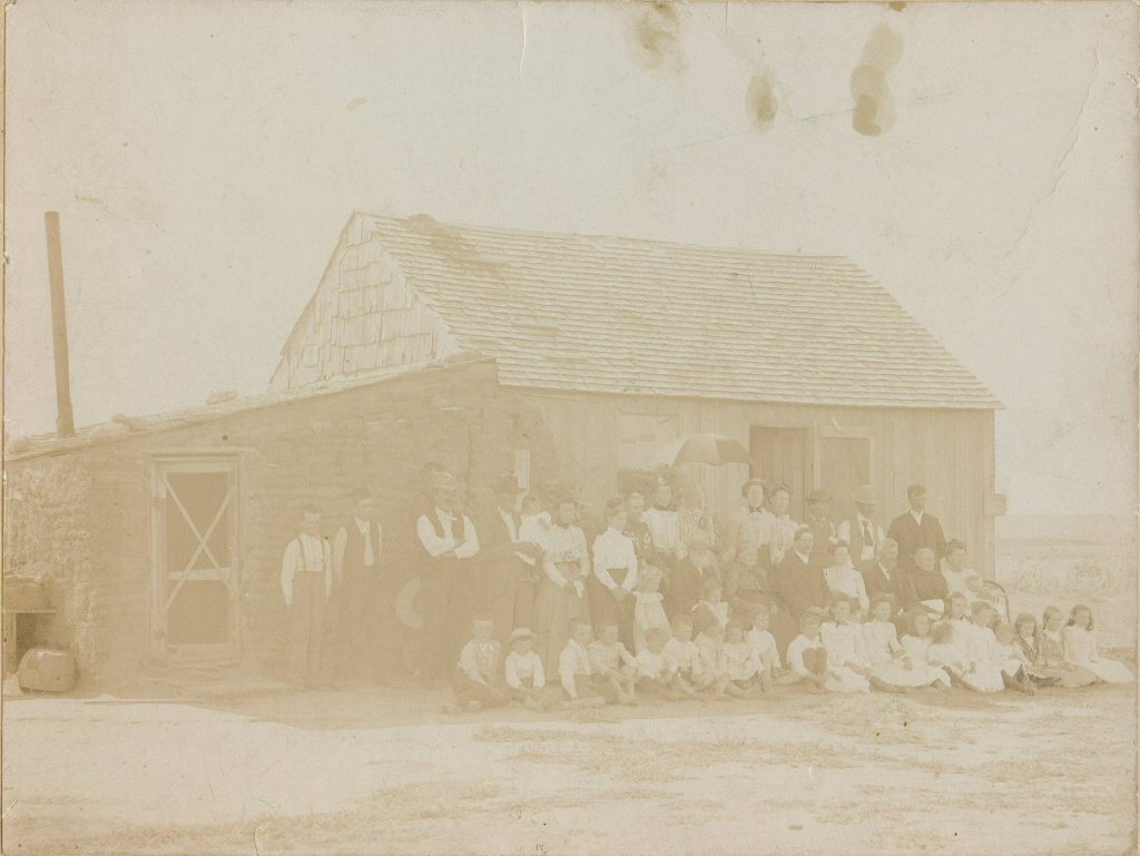 About this barren Western Country (Kansas). The only trees were along the creeks and the Republican River. Our home was a Soddy. The only building material this land offered was the sock bricks plowed from the prairie. They were thick enough to handle and laid brick stile with openings for doors and window. Poles laid length wise for the roof and sod and clay on the roof. It resembles a field with all the grass and weeds growing on top. Some walls were white washed and in many cases muslin was hung against the ceiling to catch the dirt and bits of sod that fell. Fleas, bed bugs, mice and insects were common pests. Each week the beds were taken down and saturated in boiling water composed of salt or lye. Boiling water was used to wash woodwork and walls. The bed bugs lived in high places and the fleas made their homes near the floor in the quarter-rounds. Cow chips were used in stoves (for fuel).